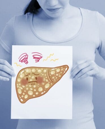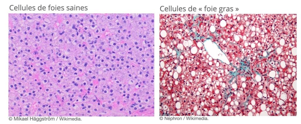 La maladie du « foie gras » – aussi appelée stéatose hépatique non alcoolique (NAFLD – non alcoholic fatty liver disease) – se caractérise par une accumulation de graisses dans les cellules du foie, en dehors de toute absorption excessive d’alcool. A cause d’une consommation trop importante de graisse et de sucre, le foie se surcharge en graisse et ne parvient plus à l’éliminer. Bénigne dans sa forme la plus simple, cette pathologie surnommée « maladie du soda » ou « maladie de la malbouffe » peut évoluer vers des complications : inflammation (stéatohépatite ou NASH, pour Non Alcoholic Steatotic Hepatitis en anglais) puis cirrhose irréversible.