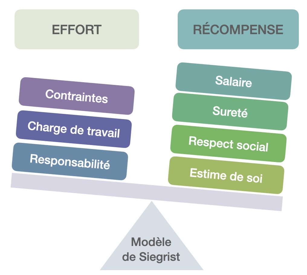 Développé à la fin des années 80, le modèle de Siegrist (du nom de son auteur, Johannes Siegrist, professeur de sociologie médicale) définit l’existence d’un stress au travail lorsqu’il y a un déséquilibre entre les efforts fournis et les récompenses reçues/perçues. Les récompenses sont déterminées sur 4 axes : (1) les gains monétaires ou reconnaissance matérielle, (2) le degré de contrôle de son statut professionnel (perspectives de promotion et la sécurité de l’emploi),(3) l’estime reçue de la part des collègues et des supérieurs hiérarchiques, (4) l’estime de soi. Les réponses des volontaires à 10 questions bien précises, et standardisées, du questionnaire « mode de vie et santé » ont permis d’évaluer différents niveaux de stress au travail. Dans la présente étude, 3 niveaux de stress ont été étudiés : faible, moyen et haut. Utile pour les recherches, le modèle de Siegrist est aussi puissant pour comprendre et agir au niveau organisationnel, managérial et individuel.